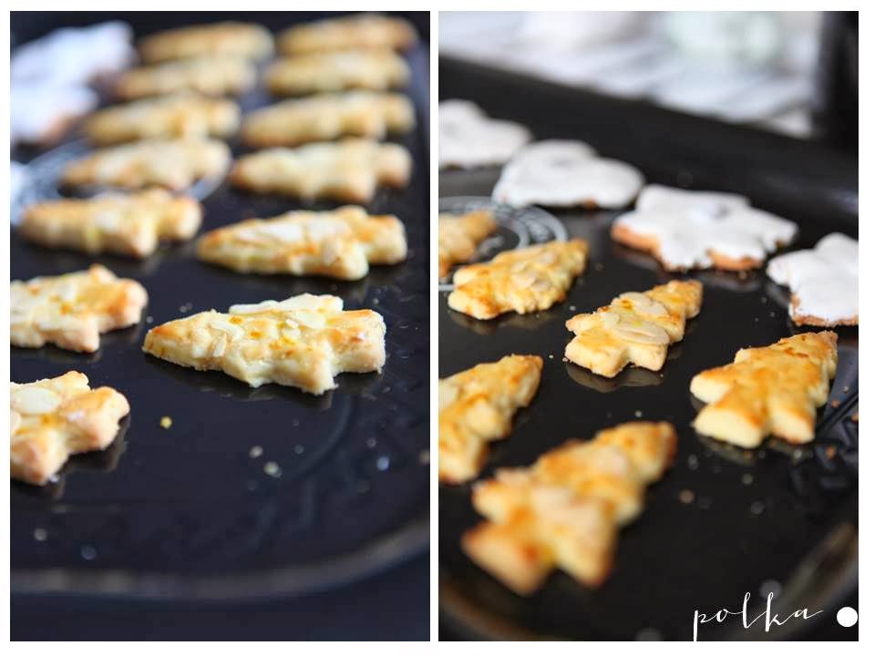 Ze składników zagnieść gładkie ciasto, można podzielić na 2 części i wgnieść dowolne bakalie: orzechy włoskie, laskowe, pistacje, żurawinę. Ja użyłam sporej garści płatków migdałowych i skórkę otartą z jednej (sparzonej uprzednio) pomarańczy. Wałkować na grubość ok. 0,5 cm na wysypanej mąką powierzchni. Do wersji marcepanowej: masę marcepanową (bez czekolady) rozwałkować delikatnie i wykrawać z niej odpowiednio mniejsze kształty (np. środek kwiatka), ułożyć na ciasteczkach przed upieczeniem. Niezależnie od dodatków, ciasteczka posmarować rozkłóconym jajkiem i piec w 180 °C jakieś 10 minut – do czasu, kiedy się zezłocą.