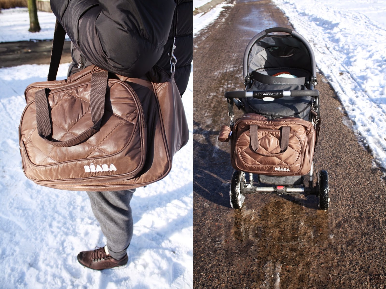 Nie mam tu dla Was żadnej złotej rady, jak usprawnić i uprzyjemnić zimowe wyjścia. Mam tylko jeden przedmiot, który to robi niezależnie od pogody, choć kompletując wyprawkę sądziłam, że to zbędny gadżet. Zdanie zmieniłam już po pierwszym spacerze bez torby do wózka, kiedy to torebka non stop zsuwała mi się z ramion, plącząc się niewygodnie, by wreszcie wylądować w koszu na zakupy. Głupio potem wyglądałam, gdy schylałam się do ziemi po portfel w każdym sklepie. Torbę od Beaba używamy już drugi miesiąc i nie wyobrażam sobie już bez niej życia. Pomieści siedem pieluch, kocyk, mokre chusteczki, butelkę z mlekiem (ma specjalny termiczny pojemnik), przewijak i trzy kilo ziemniaków. Trzymam ją spakowaną w szafie w przedpokoju i to mega usprawnia całą operację. Gdy idę tylko na spacer i drobne zakupy, wyciągam z niej te pieluchy i mam mnóstwo miejsca na ziemniaki. Gdy wychodzimy w gości czy do knajpy – pod ręką mam cały potrzebny arsenał (z ubraniami na zmianę na wypadek jakiejś gównianej katastrofy włącznie). Poza tym nie wygląda jak torba do wózka i gdy już się go pozbędziemy, będzie świetnym weekendowym torbiszczem lub bagażem podręcznym, pojemnym i gustownym, a w dodatku unisex. Wystarczy odczepić pojemnik na smoczek i nikt nie skuma, że zajumaliście dzieciakowi torbę na pieluchy 🙂