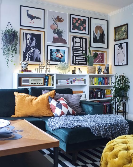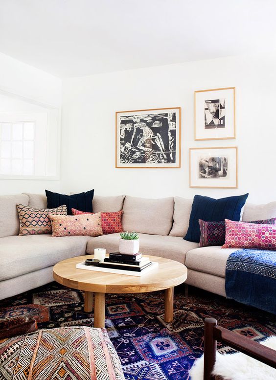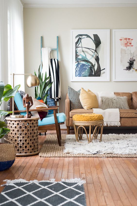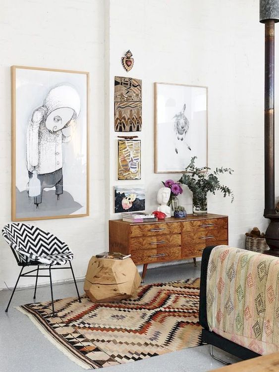 No to jeszcze parę słów o moich pomysłach i eklektycznych salonach i możecie lecieć buszować po sklepach. Składowe takich pokoi dziennych to przede wszystkim wielobarwne, zróżnicowane galerie ścienne, miks nowoczesności z retro, elementy etno – bambus i etniczne wzory, przytulność i kontrolowany luz jednocześnie. Zabawa formą, świadomość koloru, żonglowanie stylami, wnętrzarskie poczucie humoru – to jest najważniejsze, to taka fantazja, jakiej nie da się kupić. Trzeba próbować, eksperymentować, nie odtwarzać, łączyć, przestawiać, bawić się – aż wyjdzie najpiękniej. A potem zmieniać od nowa, bo takie wnętrza żyją i dojrzewają wraz z właścicielami. Już niedługo pokażę Wam, co się u nas dzieje, póki co – wymiana poduszek i dywanu, gromadzenie plakatów, drukowanie ilustracji, szukanie ramek. Jesteśmy w trakcie metamorfozy, choć trochę już widać kierunek. W najbliższym czasie chciałabym odmienić całą tę dużą ścianę z szafkami rtv i galerią plakatów, docelowo pewnie także dwie szare sofy na jedną narożną, być może w odważniejszym kolorze. Poniżej meble i dodatki, które najlepiej oddają klimat, jaki mam w głowie, jeśli podoba Wam się takie eklektyczne, radosne scandi-boho, to tu mały punkt wyjścia do rozpoczęcia tworzenia takiego klimatu u siebie: