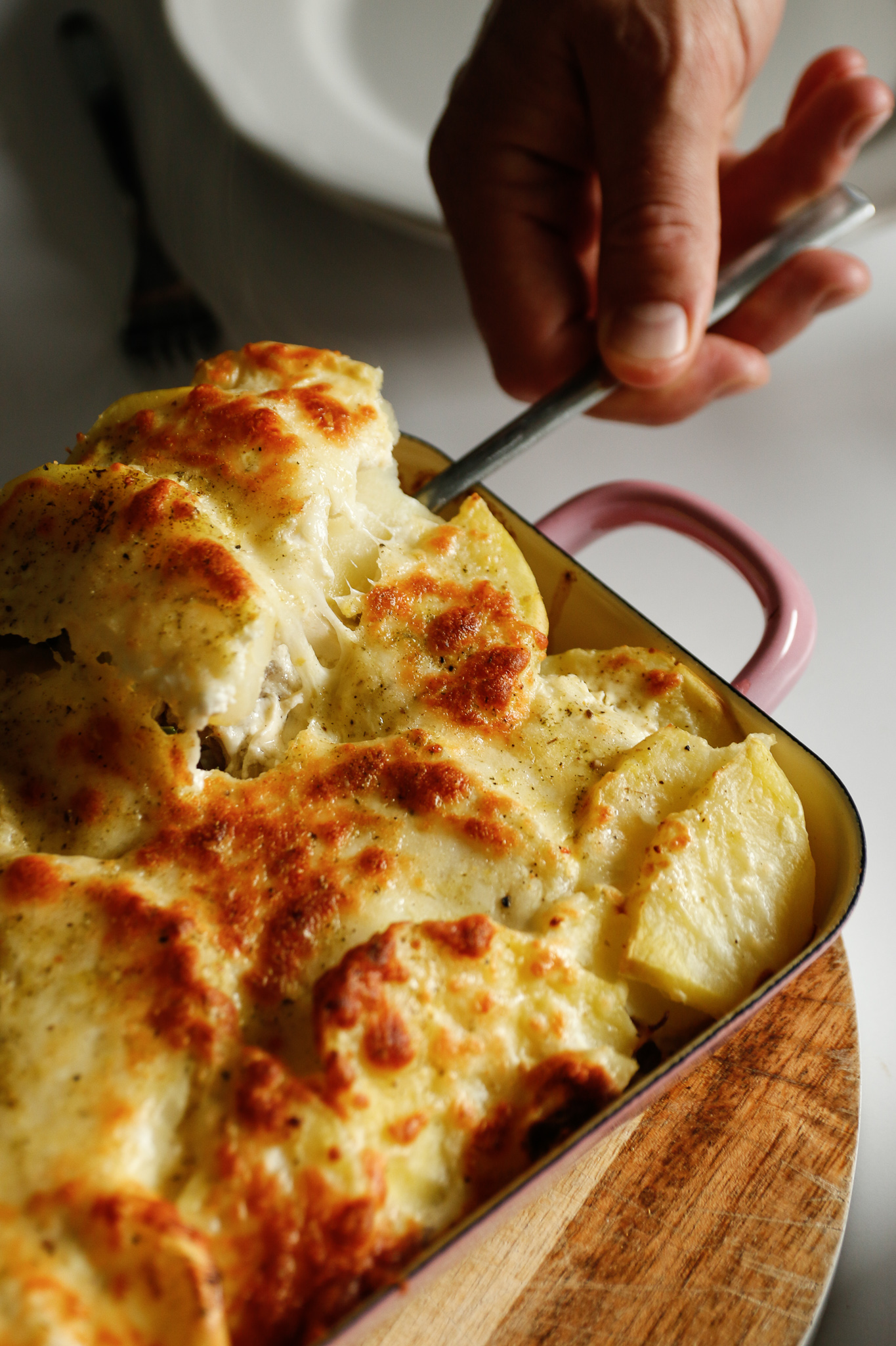Zapiekanka ziemniaczana z szarpaniną, porem i serem