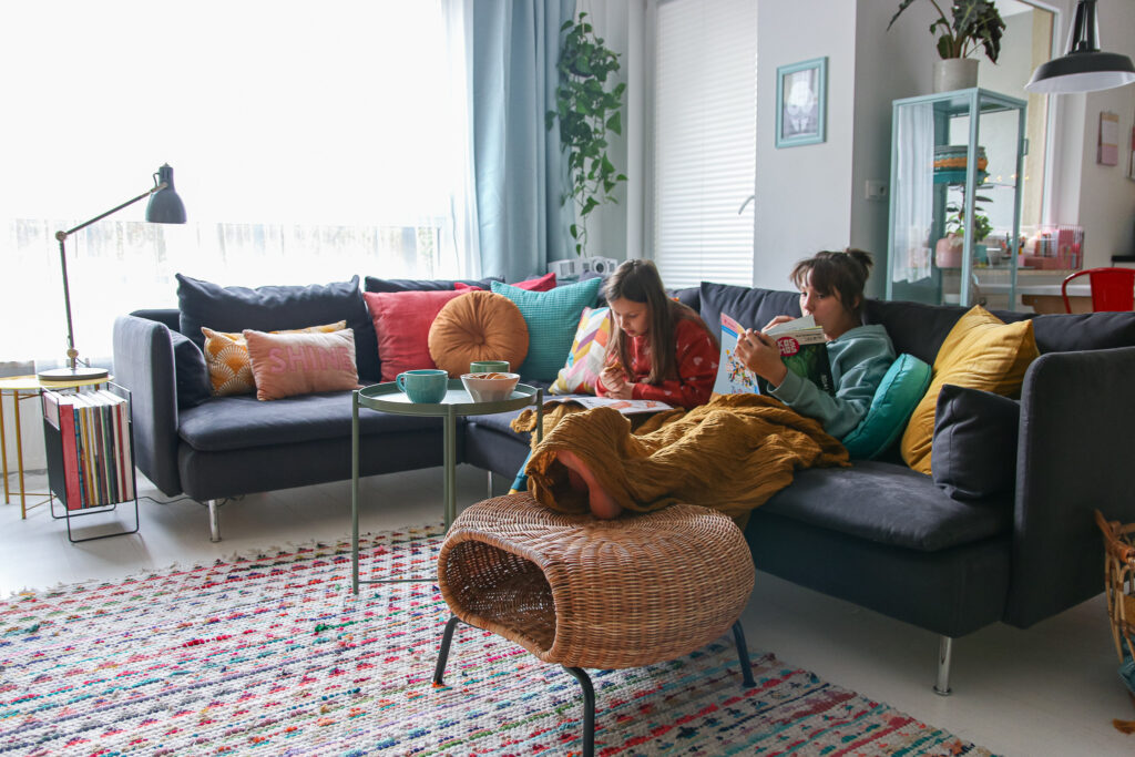 No a jeśli chodzi o to, co najbardziej lubimy w tej naszej kolorowej, salonowej oazie robić, to przede wszystkim: kokosić się, tarzać, wylegiwać, mościć wśród poduszek, zakutać w koce i rysować, kolorować, czytać i oglądać. W tygodniu to najczęściej jednak krótsze, popołudniowe moduły z książką, jakieś takie rodzinne polegiwanie i pogaduchy przy muzyce albo szkolne powtórki pod kocem. Kiedy jednak przychodzi weekend z gatunku tych ciemnych i deszczowych, gdy ciężko wyrwać się choćby na krótki spacer, oddajemy się często lenistwu totalnemu. Zdarza nam się czasem przy niedzieli zostawać przez pół dnia w piżamach, przenieść na sofę swoje kołdry i uskuteczniać poranki filmowe, przeciągając się smacznie i tuląc – dla mnie to kwintesencja pławienia się w domowym ciepełku, idealnie leniwy czas tylko dla nas. Ostatnio weszliśmy na jeszcze wyższy level upojnego nicnierobienia za sprawą słodkiego śniadania, które robi się samo – odkryłam bowiem w IKEA przepyszne mrożone gofry i puszyste bułeczki cynamonowe. Wystarczy moment w piekarniku, by cały dom wypełnił się słodkim, korzennym zapachem, a po chwili już można wskakiwać pod kołdry z ciepłym śniadaniem, zajadać i oglądać. Nie mogę sobie wyobrazić nic bardziej rozkosznego od takiego poranka – to dla mnie kwintesencja rodzinnego dobrostanu. ♥