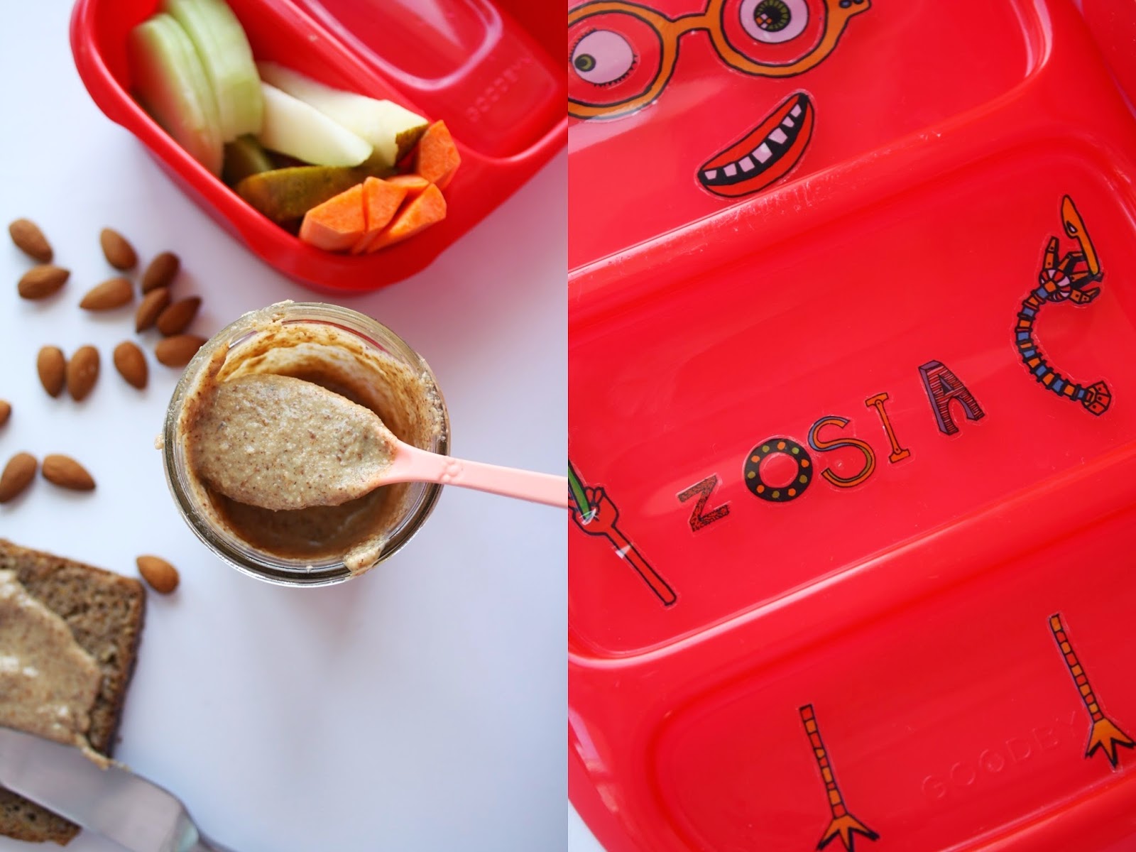 Mam na to tylko jeden pomysł – starać się bardziej. Dawać lunchówki wypełnione zdrowymi przekąskami, które będą tak pyszne, ładne i pomysłowe, że żadna mleczna kanapka nam nie podskoczy. Co powiecie na kanapki ze słodkawym, superzdrowym migdałowym masłem i bananami? Albo czystoziarnisty chleb z chrupiącymi pestkami tak smaczny, że można jeść bez niczego, jak ciasto? Ulubione świeże warzywa i owoce – u nas najczęściej kalarepa, marchewka, papryka, jabłka i gruszki, do tego garść orzechów i (zamiast soczku z syropem) truskawkowo – bananowe smoothie w bidon. Dzieciaki sikają ze szczęścia, a wszystkie danonki tego świata mogą się schować! Nie bez znaczenia jest opakowanie – u nas obecnie lunchbox z przegródkami i zestawem śmiesznych naklejek, którymi można ozdabiać pudełko.
