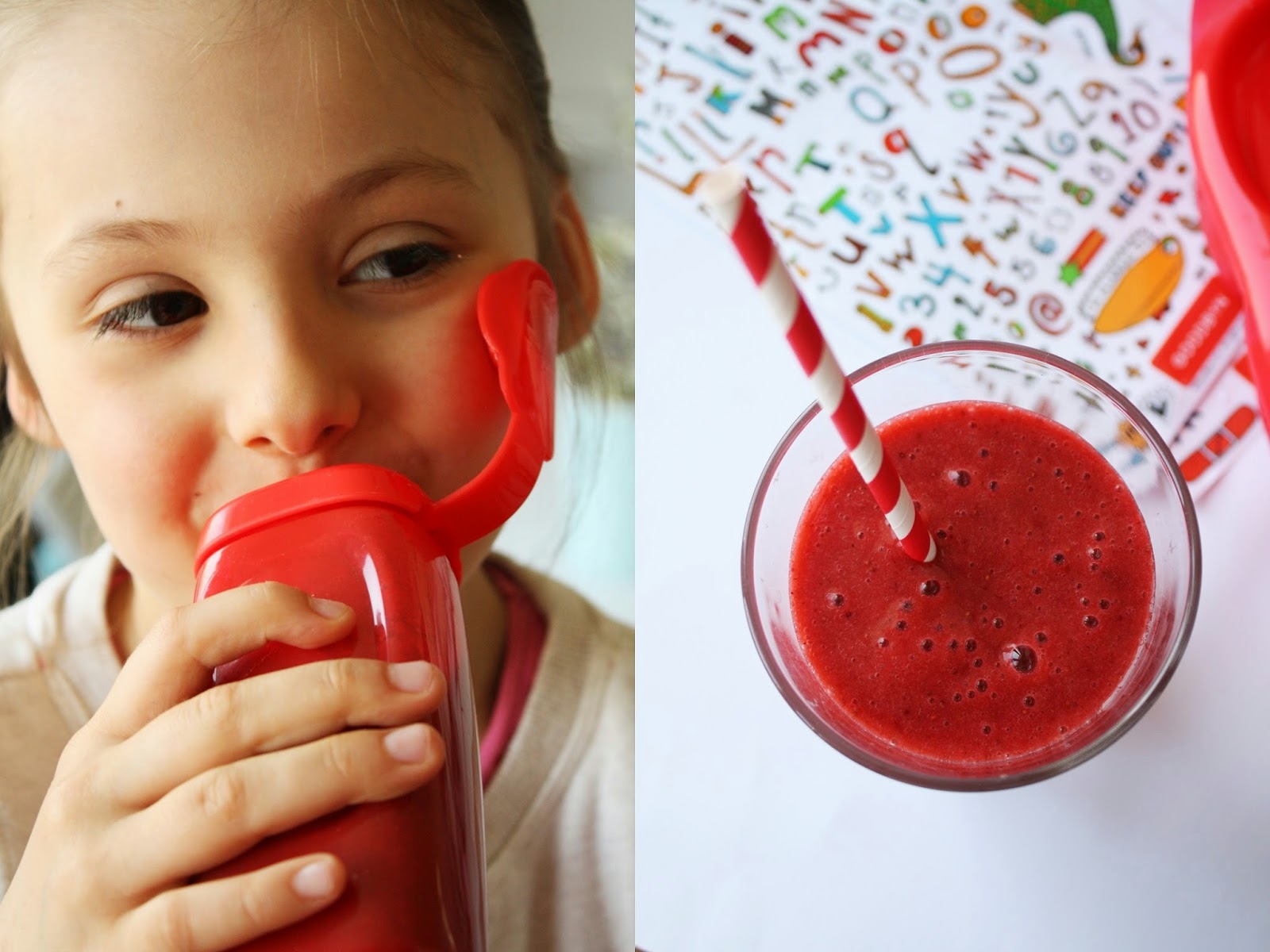 Rozmrożone truskawki i pokrojonego banana zmiksować blenderem, wlewać wodę do uzyskania pożądanej konsystencji. Nasz bidon ma spory otwór, więc napój może być dość gęsty, dostosuj ilość wody do używanej butelki.