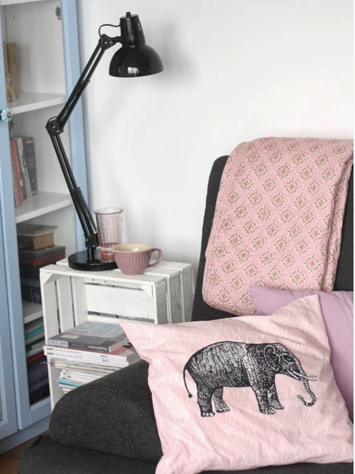 Sama codziennie wypijam szklankę smoothie, przeprosiłam się z Chodakowską i z kawosza zmieniłam się w herbaciarę (a chleb na zakwasie jest coraz bliżej). Oprócz tego podniesienia jakości życia, są też efekty uboczne. Bo siedzę w tym domu i w oczy kłują mnie przybrudzone i podniszczone ściany. Jeszcze nie maluję, ale dużo pucuję, przestawiam, układam, planuję remont i nowe regały, mierzę, dokupuję, dekoruję. Pojawiło się u nas ostatnio sporo nowości, kupiłam kilka pięknych drobiazgów, parę dostałam. Zrobiło się bardziej miętowo i kwiatowo. Szyję! Na razie głównie poduszki, ale plany są wielkie.