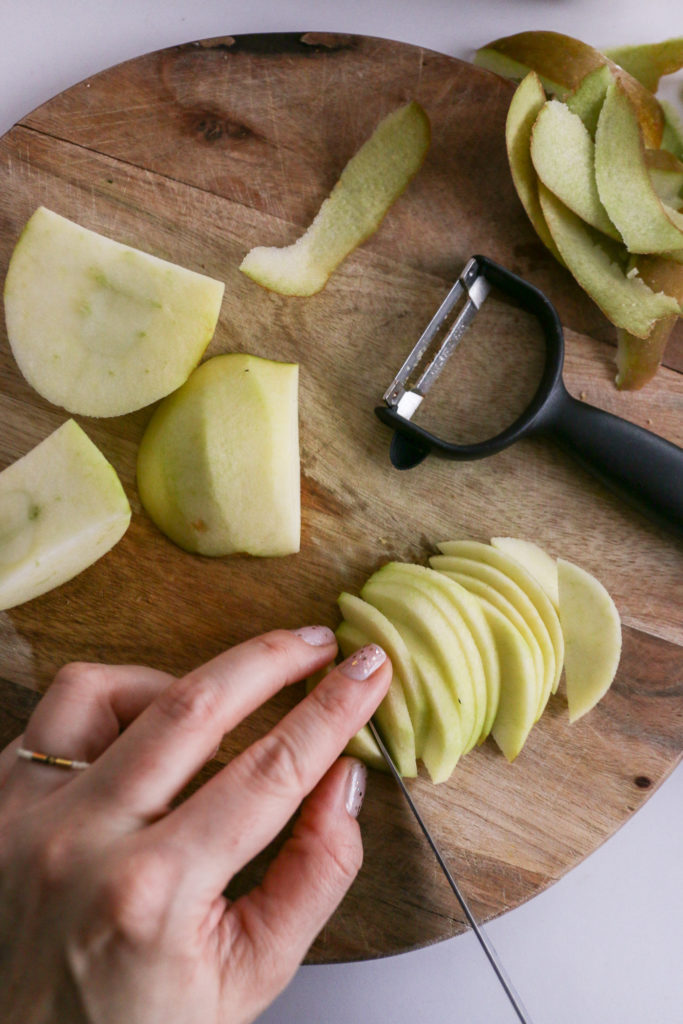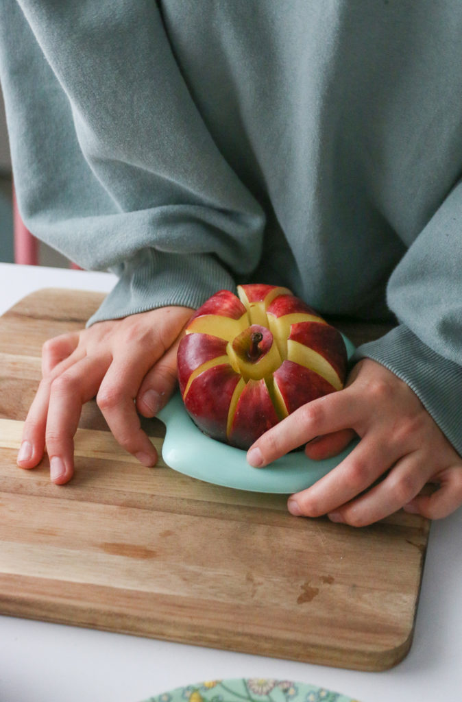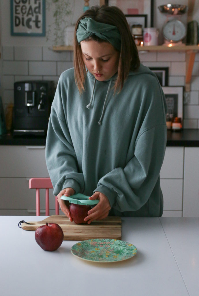 - jabłka z masłem orzechowym – plastry posmarowane fistaszkowym kremem to genialna, energetyczna przekąska, Zosia często jada je w ciągu dnia, w przerwach od lekcji online