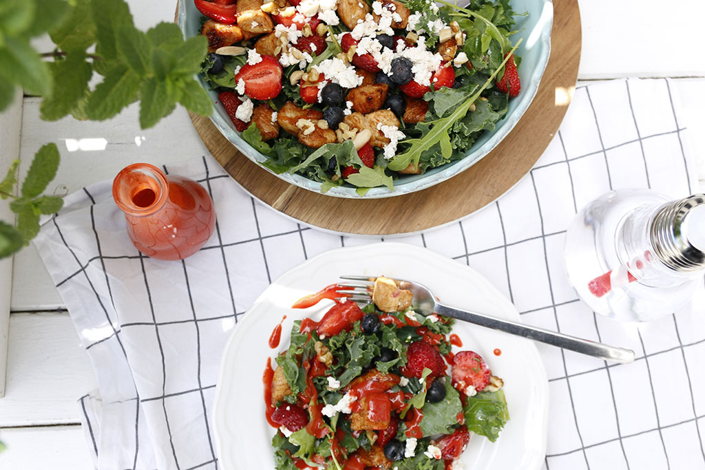 Sałatka z jarmużu z indykiem, owocami i truskawkowym winegretem