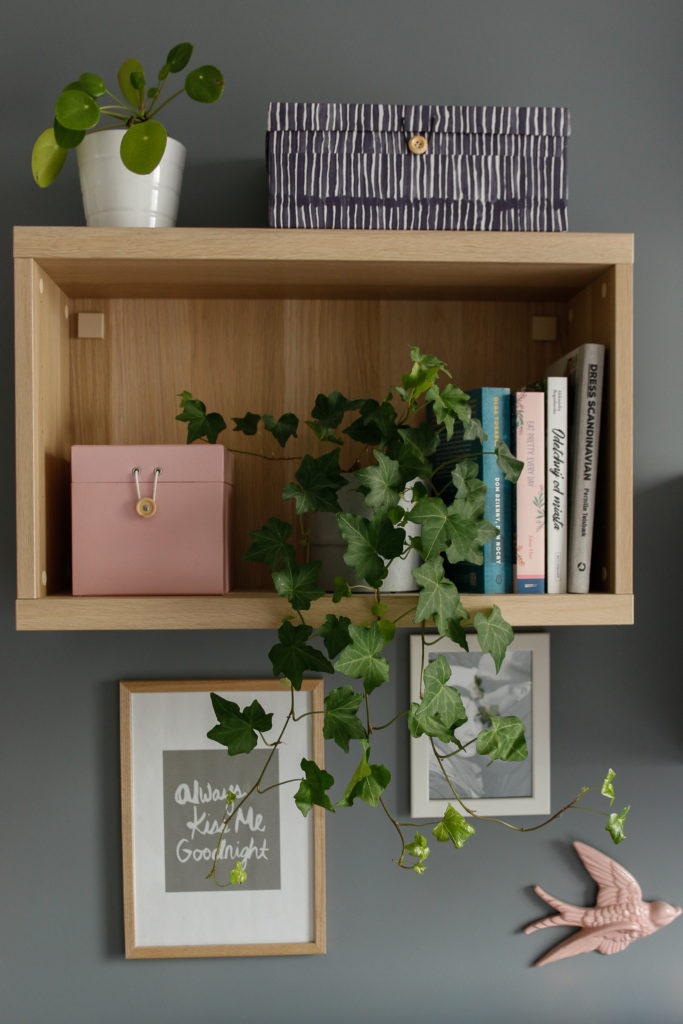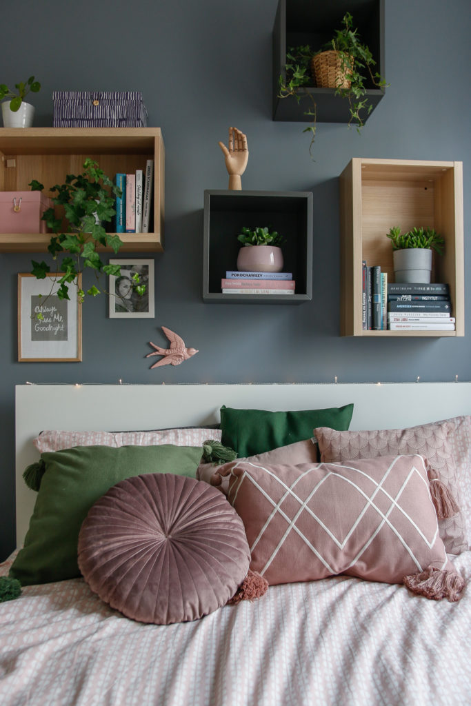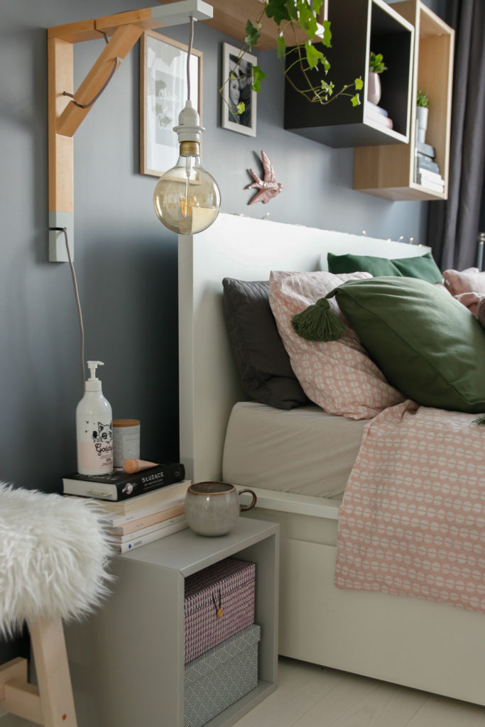 Niby żaden wymóg funkcjonalny w sypialni, ale przydaje się. Mamy sporą biblioteczkę w dużym pokoju, ale od kilku miesięcy także dodatkowy składzik na ścianie nad łóżkiem. Na to, co przeczytane i na pozycje, które czekają w kolejce. Nie będę ściemniać – o powieszeniu półek zadecydował zamysł dekoratorski bardziej niż konieczność, ale z całą pewnością jest tak, jak podejrzewałam – obecność książek w sypialni ociepla ją i motywuje do czytania. Wciąż bardzo lubię tę naszą kombinację kubików EKET i półek BESTÅ.