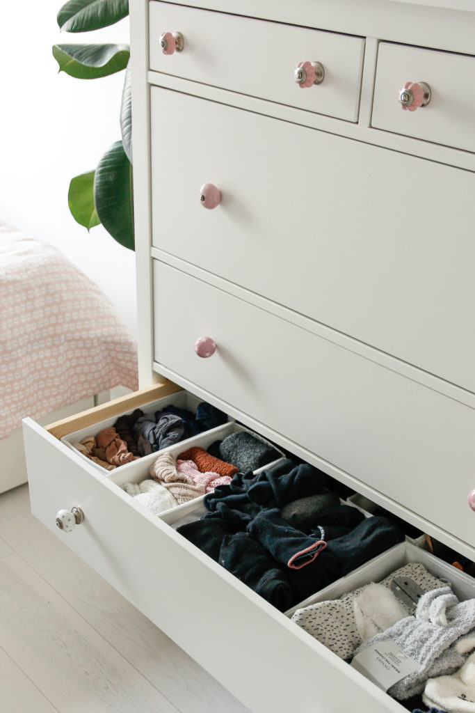 Żeby nie było – bardzo ją lubię. Choć dziś sobie myślę, że w tym miejscu zmieściłby się już taki konkretny dwudrzwiowy PAX i momentami trochę jednak żałuję. Wtedy wydawało mi się, że wysoki mebel w tak małej sypialni całkowicie ją zagraci, a przecież w IKEA można dowolnie wybierać pomiędzy wysokościami, głębokościami obudów, jest też mnóstwo kolorów drzwi i wzorów uchwytów. Oferta znacznie się poszerzyła i bardzo mnie korci, żeby złożyć sobie jeszcze kiedyś jakąś spersonalizowaną kombinację. No ale wtedy stanęło na HEMNESIE. Bardzo udana i wdzięczna to seria, funkcjonalna i mimo swojej prostoty – taka sielska. Lubię w tych meblach ich uniwersalność, są bardzo plastyczne – wystarczy zmiana gałek, by odmienić ich charakter. U nas od razu poszły w ruch zapasy tych pastelowych, ceramicznych, za którymi niezmiennie przepadam. Do szuflad obowiązkowo – małe pojemniki SKUBB albo STUK – ja dokupiłam jeszcze kilka tych drugich i mam nadzieję, że nie dojdziemy więcej do stanu sprzed porządków ;).