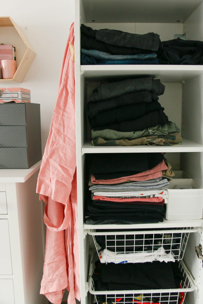 W tym miejscu, jak sądzę, wypadałoby stwierdzić, że fajnie jest ze mną dzielić sypialnię. Bo nie tylko w plecy podrapie i ukocha ta żona, ale jeszcze gacie człowiekowi zorganizuje i pomoże skarpetki sparować. Słowa te, rzecz jasna, na żadnym etapie porządków nie padły, co nie zmienia faktu, że jestem z siebie całkiem dumna. Bo taką stajnię Augiasza w trzy godziny rozpykać, to ja mówię Wam – łatwo nie było. Co i jak tu sobie zorganizowaliśmy – o tym poniżej. Spisałam, co wiedziałam na temat przechowywania w małej sypialni – nie tylko ubrań, ale i innych skarbów.