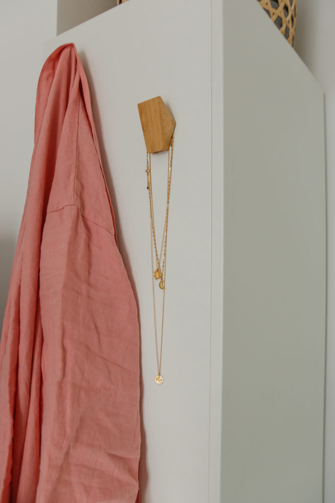 I jeszcze jeden pomysł – do powieszenia szlafroka, torebki czy ulubionych naszyjników świetnie sprawdzą się pojedyncze wieszaki, zamocowane do ściany albo boku szafy. Ja przyczepiłam dwa bambusowe haczyki SKUGGIS za pomocą taśmy mocującej, zyskując miejsce do odwieszenia np. koszuli nocnej czy biżuterii właśnie.