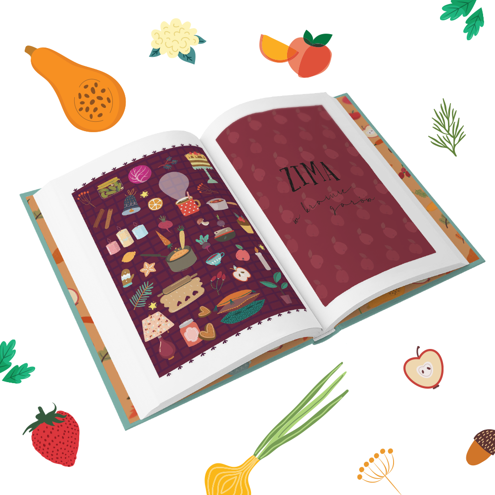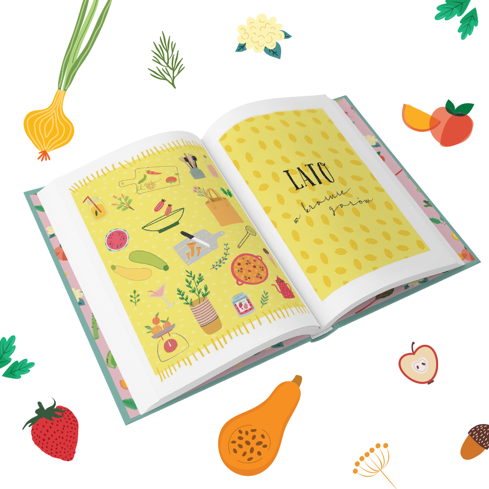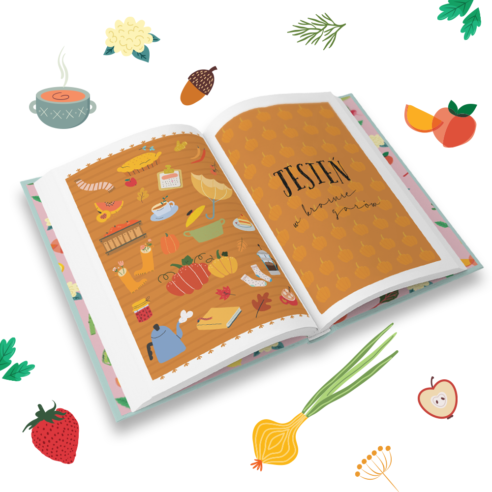 Do tego dorzuciłam pięć okołokulinarnych felietonów w charakterze wstępów, całość okrasiłam apetycznymi fotkami sezonowych owoców, warzyw, kwiatów i krajobrazów, a Marta Soboń – najzdolniejsza graficzka, a prywatnie moja kuzynka, spięła to w całość swoimi cudownymi ilustracjami. Poniżej mały podgląd każdej z pór roku 🙂
