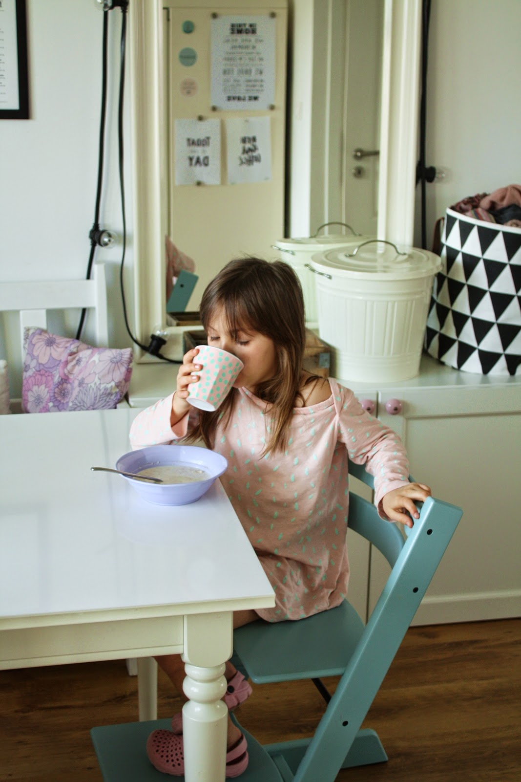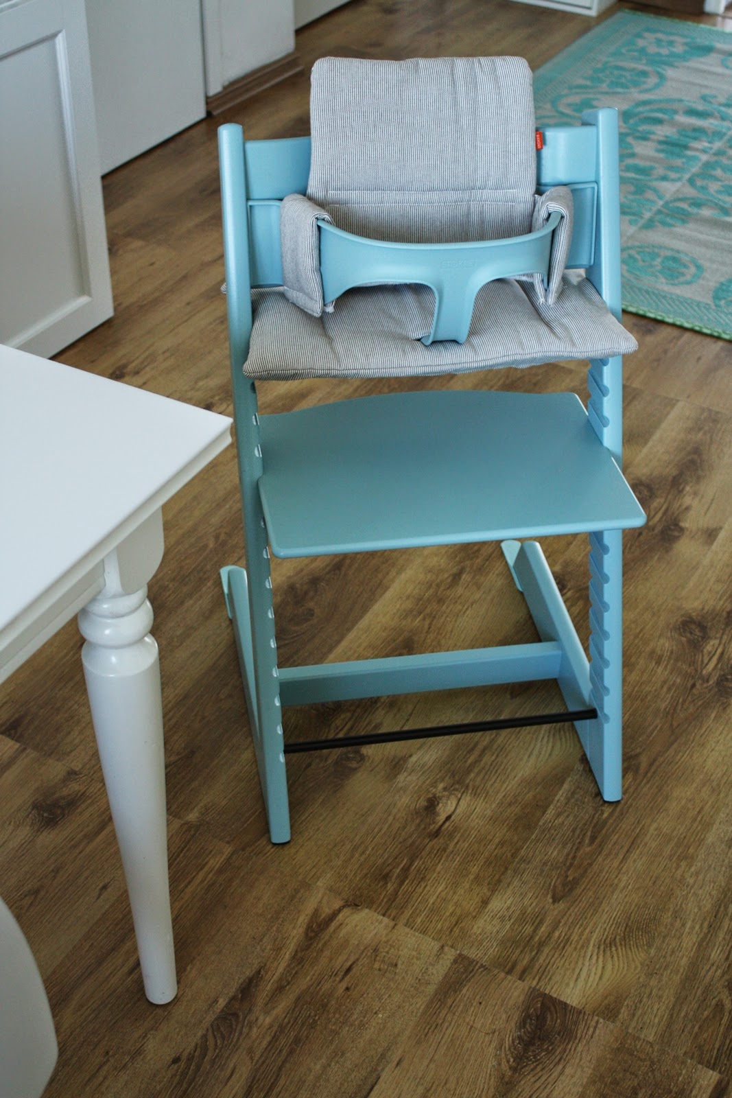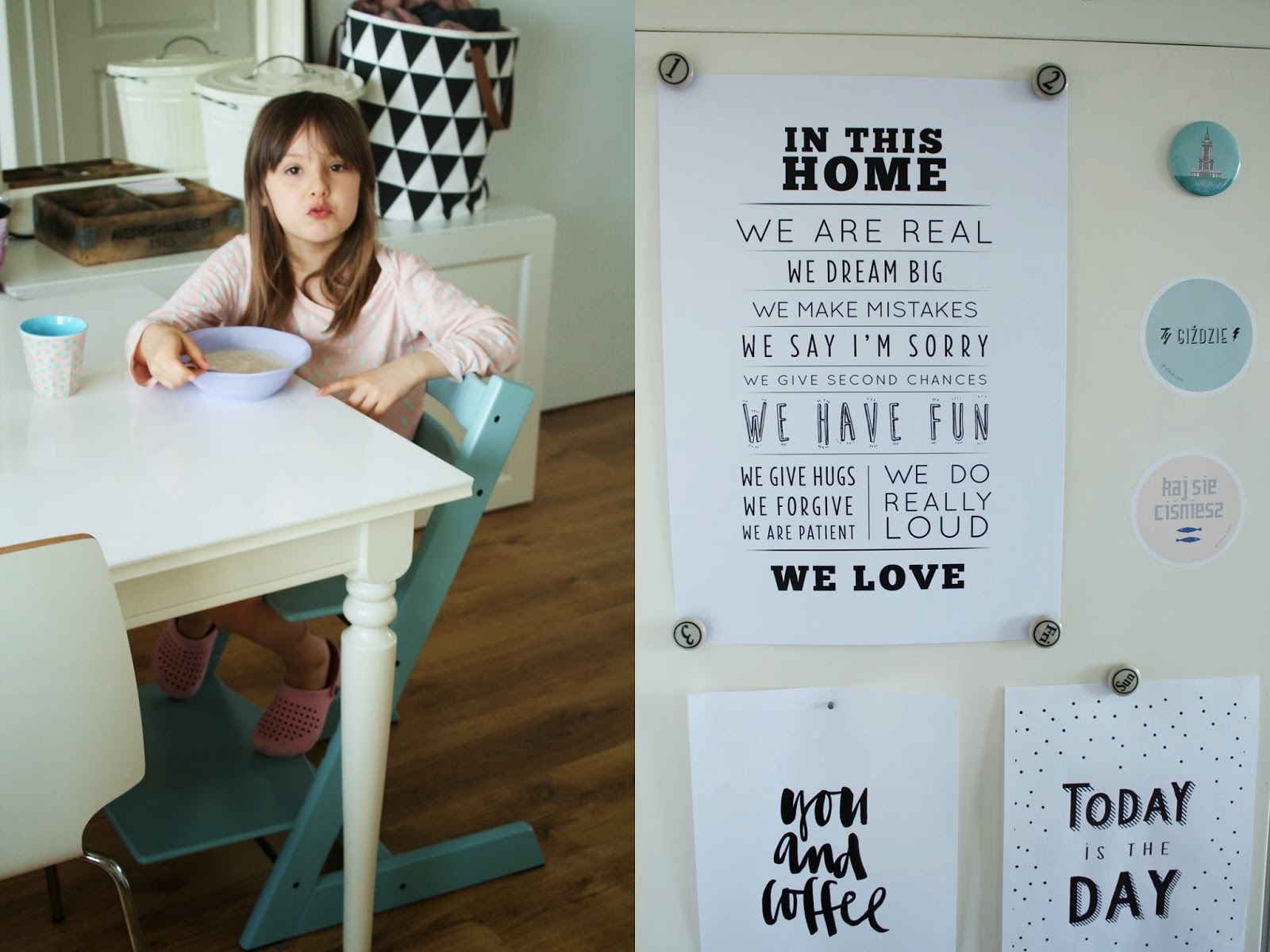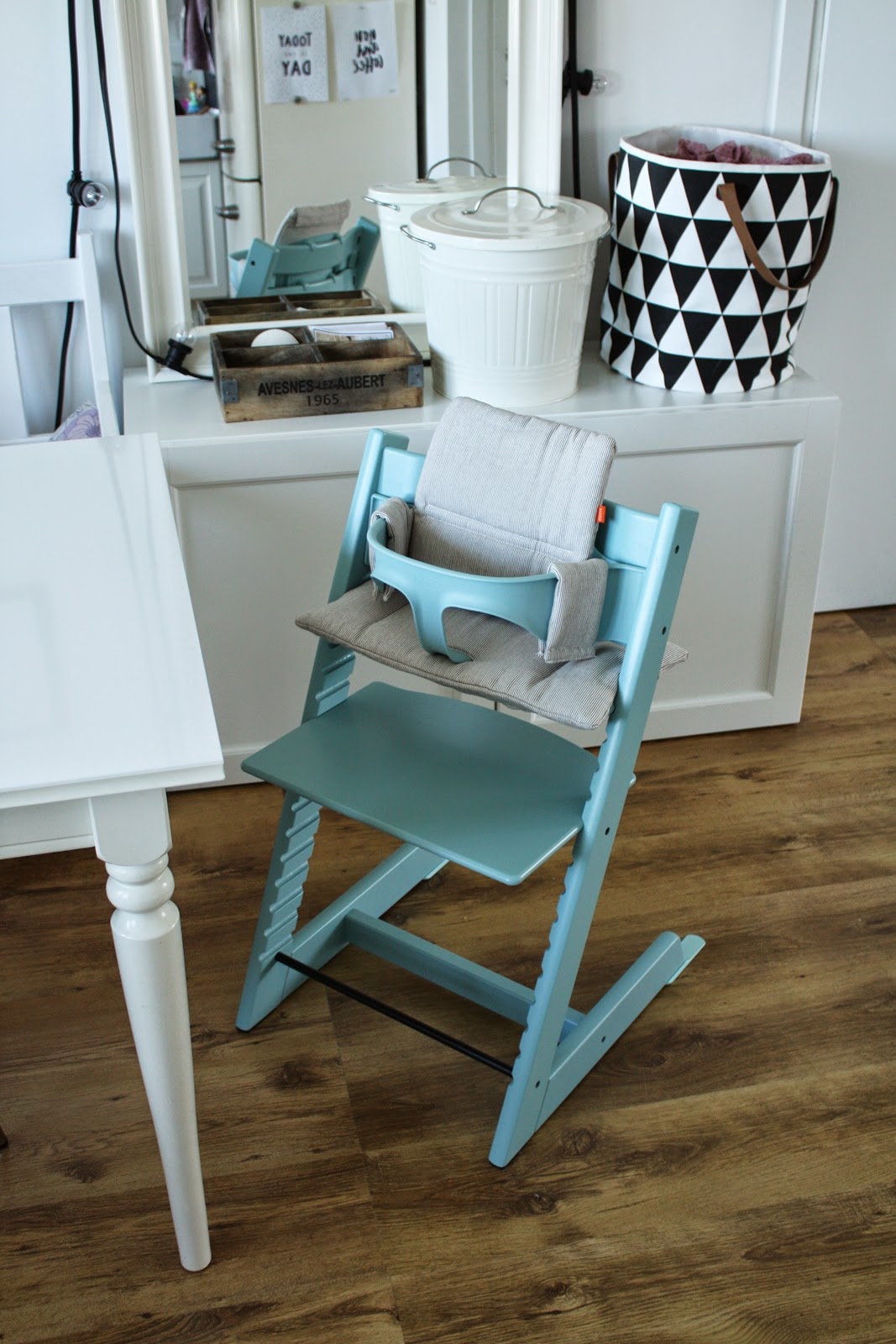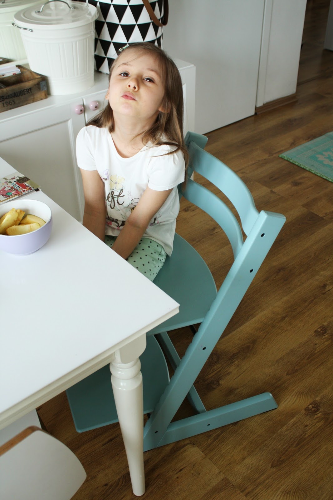 Początkowo pragnęłam klasycznego, uniwersalnego Tripp Trappa w kolorze białym, potem kusiła mnie czerń, by ostatecznie zamieszkało z nami krzesełko w odcieniu Aqua Blue. Nie byłabym sobą, gdybym już nie zdążyła pożałować swojej decyzji – początkowo zła byłam na siebie, że tak zaszalałam, ale teraz się cieszę. Uwielbiam w naszym mieszkaniu to, że praktycznie każdy mebel pasuje do każdego pomieszczenia i ono też takie jest. No i jest dziecięce, Hanulowe, to taki jej akcent w naszej jadalni. Nie mogę się doczekać, kiedy wreszcie ufajda je marcheweczką 🙂