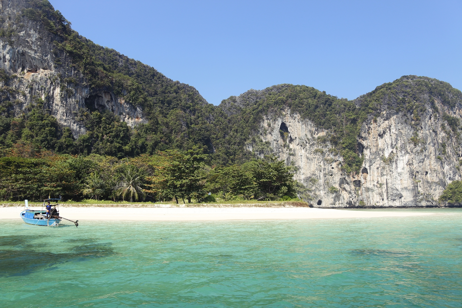 Kolejne miejsce tak nieprawdopodobne, że większość czasu spędziłam tam, zastanawiając się, czy przypadkiem nie śnię. Drugi rejs z Koh Libong zorganizowaliśmy sobie sami, korzystając z usług tubylców. Podczas wieczornego spaceru dojrzeliśmy tablicę z odręcznie napisanymi nazwami wysp i cenami, które były kuszące. Wycieczkę umówiliśmy z panem praktycznie na migi, wpierając się tylko akcesoriami do ustalenia terminu (kalendarz ścienny) i godziny (zegar). Bez zaliczek ani pokwitowania, więc nasze europejskie umysły jednak do końca powątpiewały, czy wyruszymy, ale okazało się, że mamy do czynienia z solidną firmą. Po godzinie rejsu dopłynęliśmy do wyspy, na której nie ma żadnej cywilizacji, bo oprócz dwóch pięknych plaż reszta to skały. Turystyka ogranicza się tam do paru namiotów przy jednej z plaż, druga natomiast była tylko dla nas, a jedyne ślady człowieka stanowiły rybackie wiaty i sieci przechowywane w krzakach. Znowu – bialutki, delikatny piasek, cudowna, czysta woda, a do tego te skały – groty, jaskinie, skalne tarasy, stalaktyty, stalagmity, zwisy, nawisy i co tylko, a wszystko tworzące nieprawdopodobną scenerię. Najlepsze chwile wakacji!